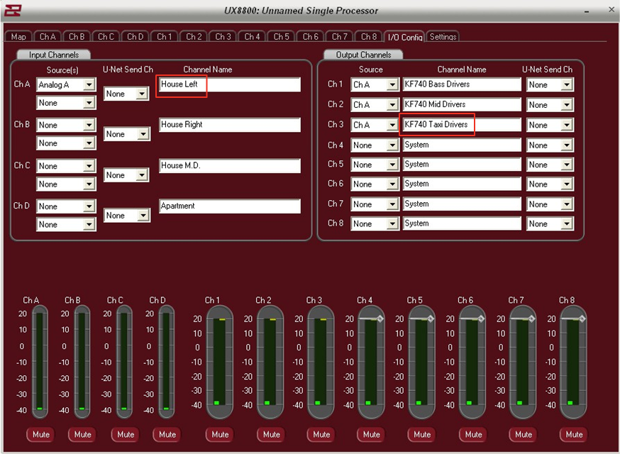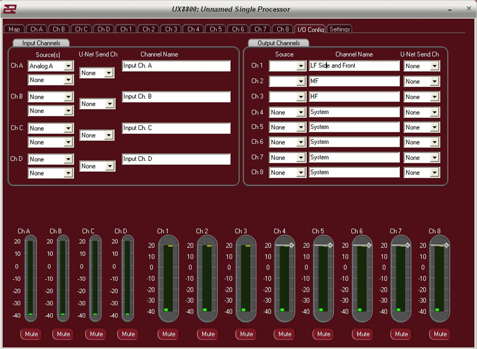 The I/O Config page is designed to allow the user to easily access input as well as U-Net assignments for the UX8800. It is also the place to enter in names for both the input and output channels of the UX.